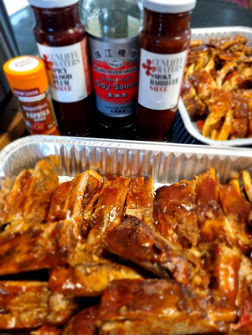1. Combine sauces and paprika and rub over the rib racks, leave to marinate for at least 1 hour or overnight.