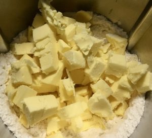 - Add the cubed butter (room temperature if using the mix master and chilled if using the food processor or Thermomix)