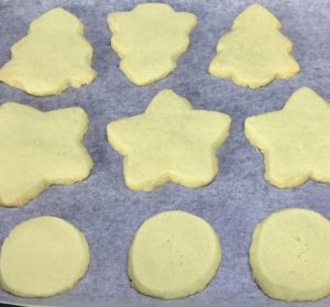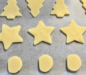 - Cut shortbread in slices to desired thickness and place on lined oven trays, or roll out then use cookie cutters to cut into shapes.