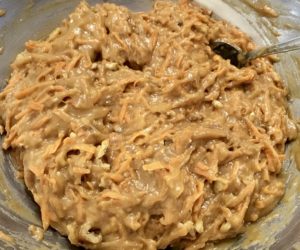 - Add carrot, oil and lightly beaten eggs, mix well and spoon into cake tin.