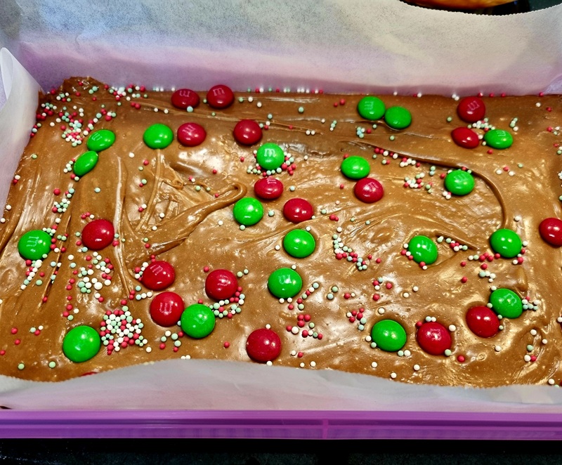 A no bake slice with a biscuit base and fudgy chocolate topping with Red and Green M&M's