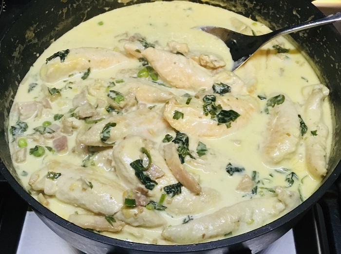 - Add chicken back to the pan with peas, spinach, lemon juice and rind, parsley, salt and pepper, simmer a further 5-10 minutes or until chicken is cooked.