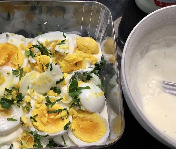 It is very simply just boiled eggs sliced and covered with a combination of an equal amount of mayonnaise and cream with salt and pepper. It is very simple but delicious none the less.
