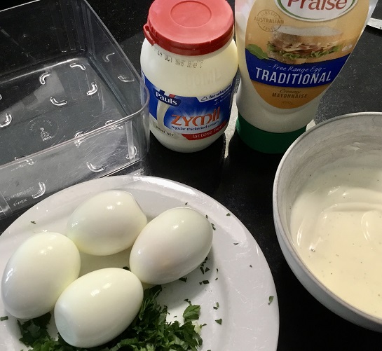 1. Hard boil the eggs, I place the eggs in a saucepan and cover with cold water, bring to the boil and boil for 4-5 minutes then run cold water over the eggs for a few minutes to cool.