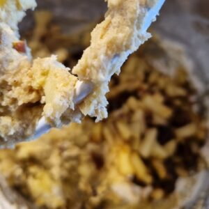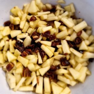- In a bowl combine apples, dates, bicarb soda and boiling water, stand until it cools to warm.