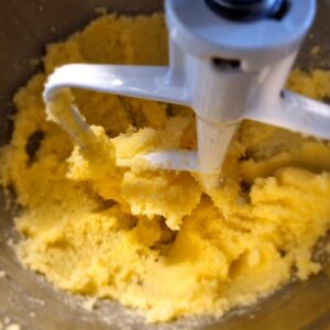 - In a bowl beat the butter, sugar and vanilla until light and creamy, add the egg, beat again until combined.