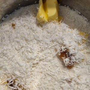 - Combine butter, sugar, milk and coconut in a small saucepan, stir over low heat until butter is melted and sugar is dissolved.