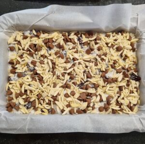 - Sprinkle in layers the chocolate bits, sultanas, coconut and almonds.