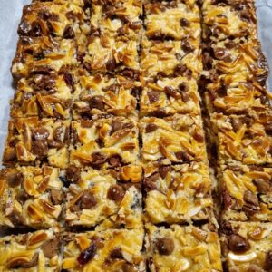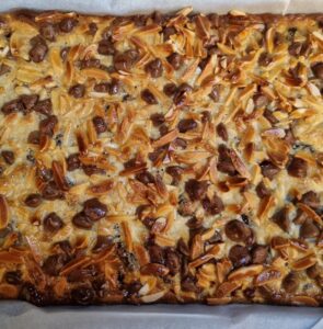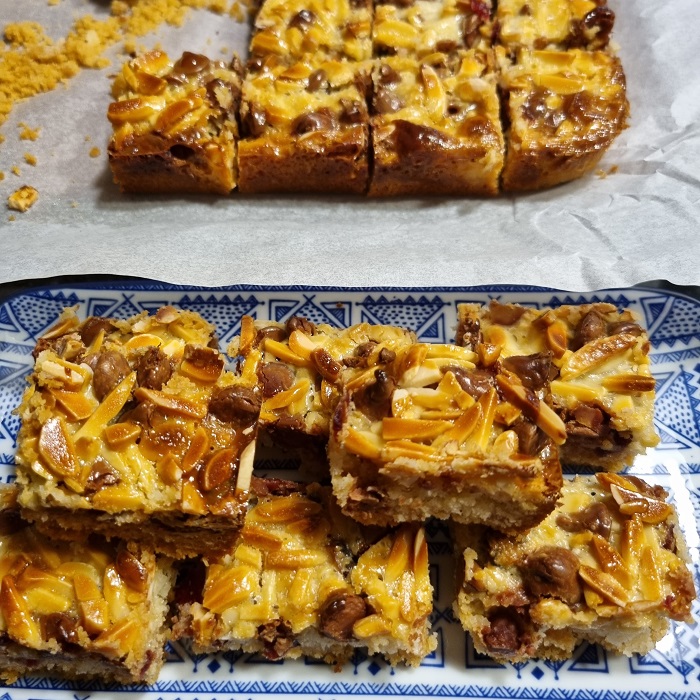 This is my take on a recipe that was on the label of a condensed milk can many moons ago, it’s called magic slice because the ingredients are layered in the slice tray and when baked it all comes together. Magic slice is deliciously chewy and has the appearance of a complicated slice but that is far from the truth.