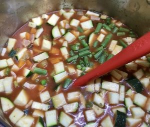 - Stir in the passata, tomato paste, stock, potatoes, zucchini, green beans, kidney beans, salt, pepper, basil, bring to the boil.