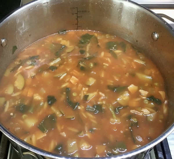 - Add the risoni, peas and cabbage or spinach simmer a further 10 minutes.