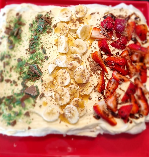 The toppings are endless for a pav, freshly whipped cream to start and any chopped fruit or chocolate bar are quick and easy toppings or to add a bit of flair top the whipped cream with sliced banana and dollop with caramel to make a Banoffee Pav, or top cream with mixed berries and a berry coulis (sauce) for a vibrant dessert.
