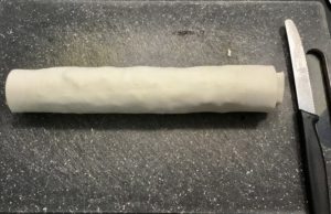 - Wet the end of the pastry without sauce and roll pastry with filling up into a log sealing the end.