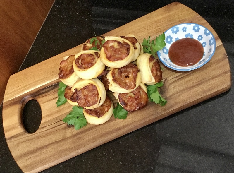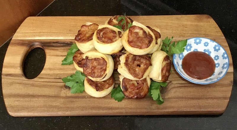 Crispy pastry spirals filled with pizza toppings, snack food, finger food favourite.