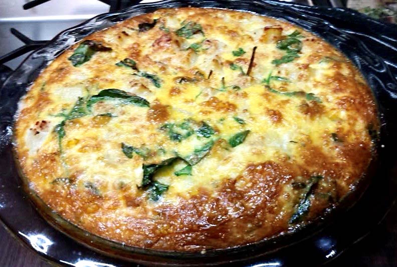 - Heat oil in pan cooking onion, garlic and bacon stirring until onion is soft, add spinach cook until wilted, add to the potatoes with half the cheese toss until combined and put into greased quiche dish.