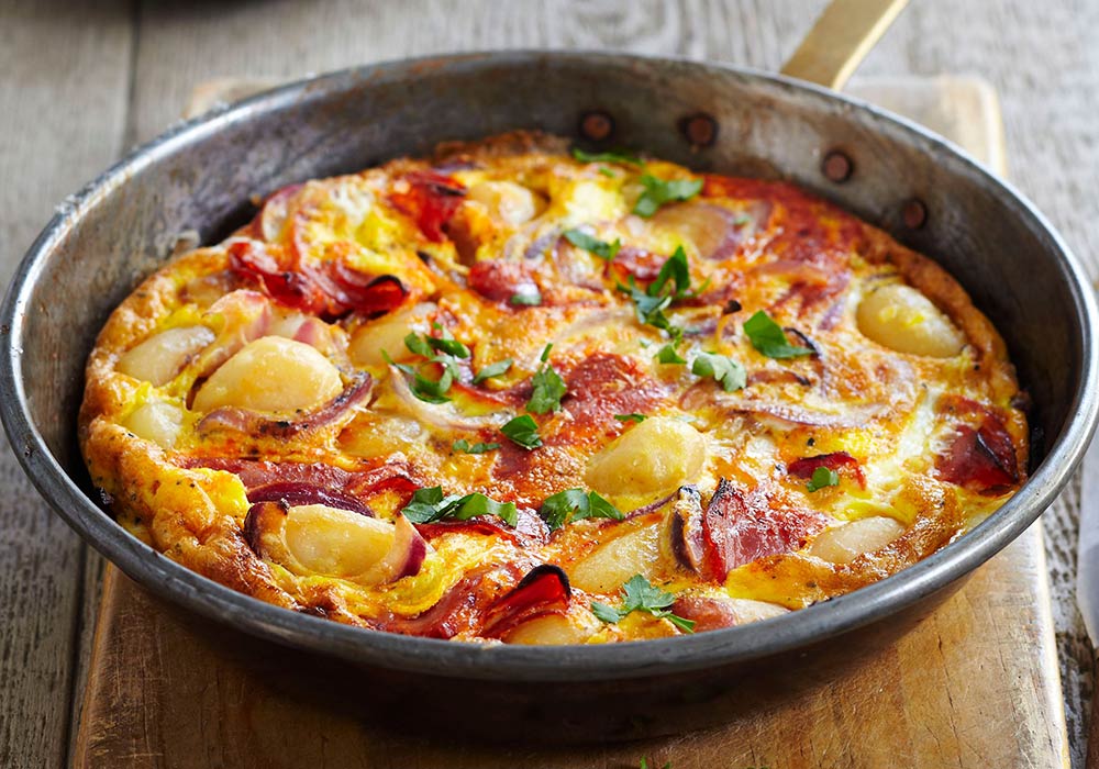 - Whisk eggs and milk in jug,pour over potato mixture sprinkle with salt, pepper and remaining cheese, bake in oven approximately 45 minutes or until browned and egg mixture is just set.