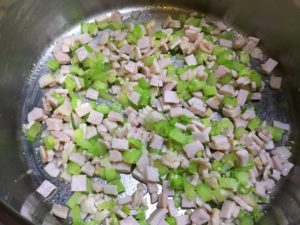 - In a large saucepan add oil, onion, bacon and celery, gently fry for 5 minutes or until onion is softened.