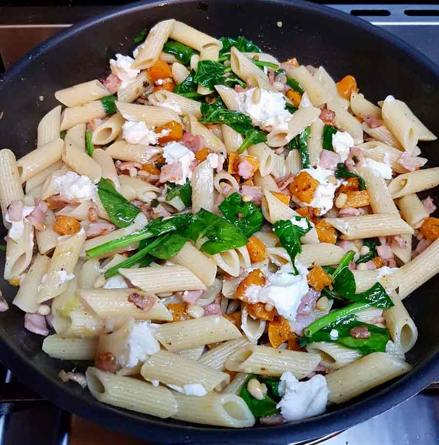 A light pasta with crispy bacon, fetta, roasted pumpkin and pine nuts.