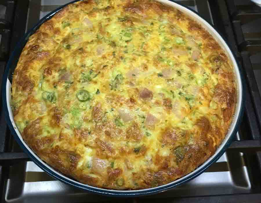 - Add eggs, milk, parsley salt and pepper, combine well, pour into a well greased quiche dish or baking dish.