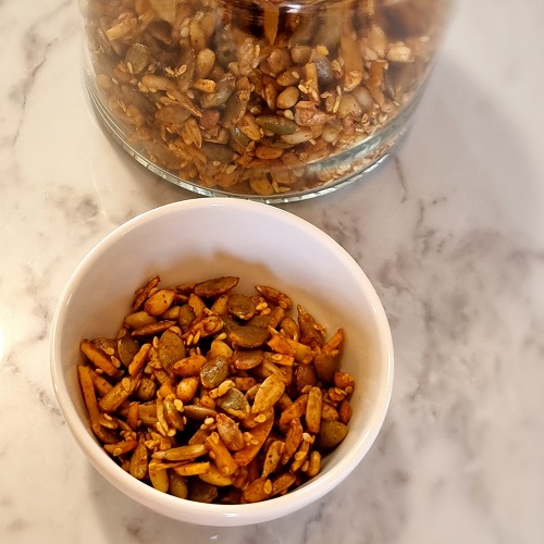 Take your salads to another level with this delicious crunchy mix of nuts and seeds. A simple green salad takes on a new life with this topping.