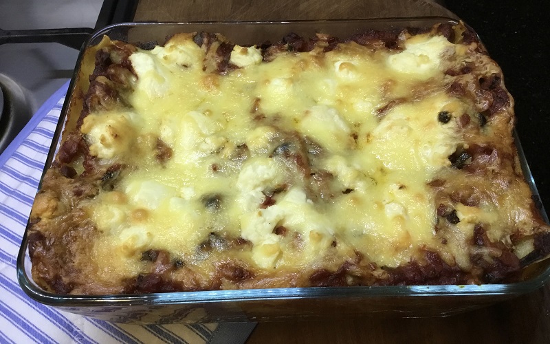 - Pour white sauce over top layer and sprinkle with mozzarella cheese and bake in oven for 50-60 minutes or until golden.